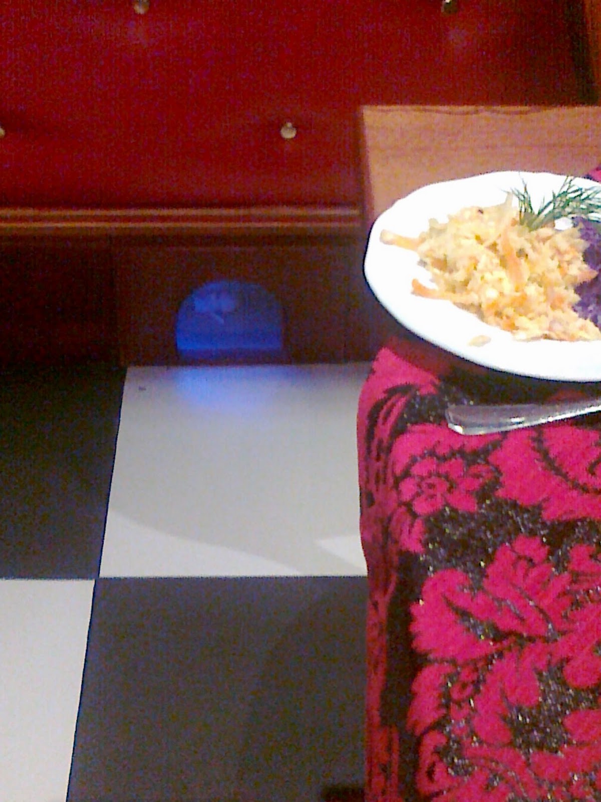 Oczywiście jest w tym dużo kiczu. Kicz jest w tonacji czerwono-różowo błyszczącej i początkowo myślałam, że to stylizacja na wiktoriański dom publiczny. Ale nie, chodzi o Alicję z Krainy Czarów. Będąc córką anglistki nie miałam specjalnie wyboru i czytałam ją w dzieciństwie w oryginale, i zostały mi w głowie na zawsze takie kawałki jak "eat me", "curiouser and curiouser", "follow the white rabbit". Dlatego film mnie z lekka załamał. Knajpka bardziej podąża za tym nastrojem niż film.